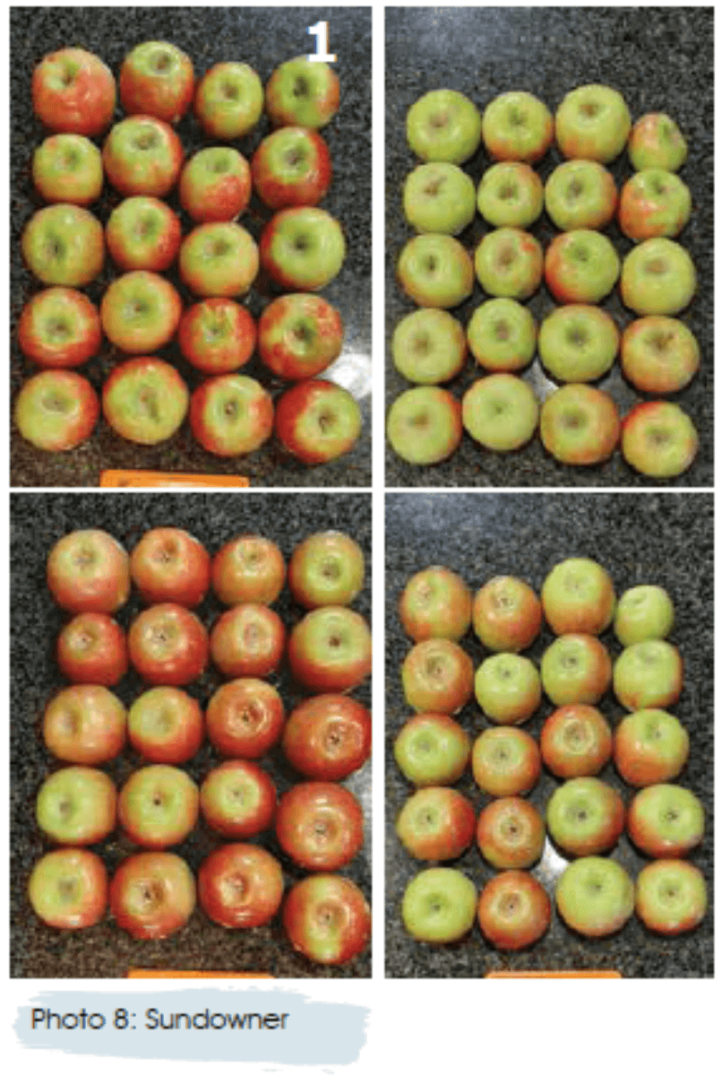 These practices do however vary among growers and apple varieties. While some varieties go through all three harvesting stages, other varieties are only harvested once (with the aim of having as many fully coloured fruit as possible at that time). These various harvesting procedures had an obvious effect on the assessments of these commercial trials.